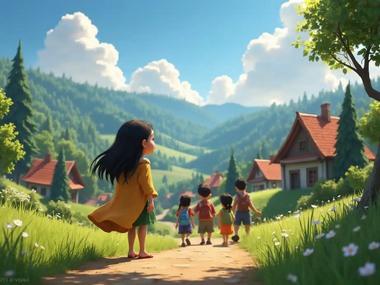 "Shuhudieni mhusika mkuu mchanga, Mia, akikaribia kikundi cha watoto, akitembea katika kijiji cha kuvutia kilicho kati ya milima na misitu ya kijani, mtindo wa Pixar, picha ya ubora wa juu, picha, 4K, 3D"