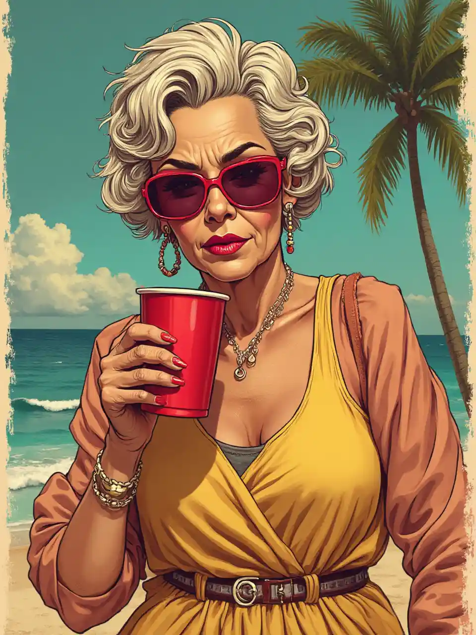Miami bibi kushikilia kikombe nyekundu kuvutia poster-style kuchora na picha inayowakilisha mtindo iconic.