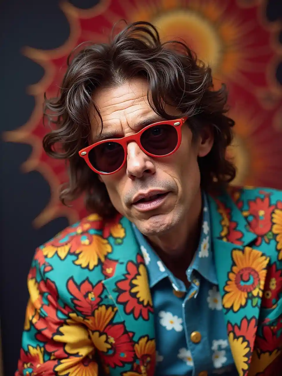 picha ya kugeuka kwa mhimili wa Mick Jagger akiwa amevaa koti lenye miundo mkali na miwani ya wayfarer, rangi zenye nguvu, rangi tofauti