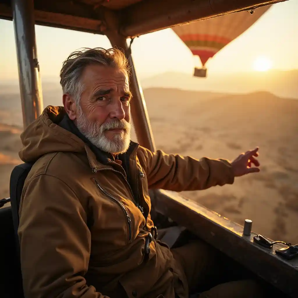 Akiruka na puto la hewa yenye joto juu ya bonde la dhahabu, mwanamume wa Mashariki ya Kati mwenye umri wa miaka 50 na kitu anatoa mwangaza akiwa na koti lenye mado. Milima na mapambazuko ya jua humweka katika mazingira, na utulivu wake na uso wake wenye kuharibika kwa hewa huonyesha hisia za kusisimua na za muda mrefu katika anga la hewa.