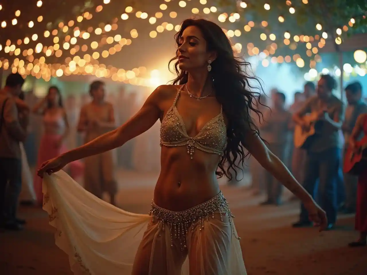 Mwanamke mwenye hisia za Mashariki ya Kati mwenye umri wa miaka 20 na kitu, anacheza chini ya taa za miamba, mavazi yake ya kucheza dansi ya tumbo yakiangaza, na sherehe zenye nguvu na wanamuziki wa nyuma.