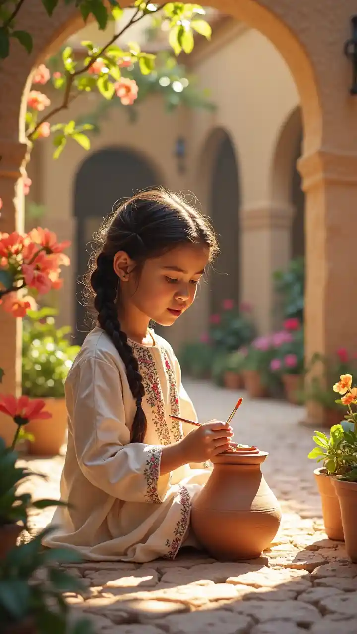 Msichana mwenye umri wa miaka 8 kutoka Mashariki ya Kati mwenye mikunjo anachora sufuria kwenye ua ulioangazwa na jua, akiwa amevaa vazi lenye rangi ya maua. Maua yenye kupamba na matao ya mawe humweka katika mazingira yenye utulivu, na msumeno wake wenye uangalifu hutoa msukumo wa ubunifu na kuvutia kwa jua.