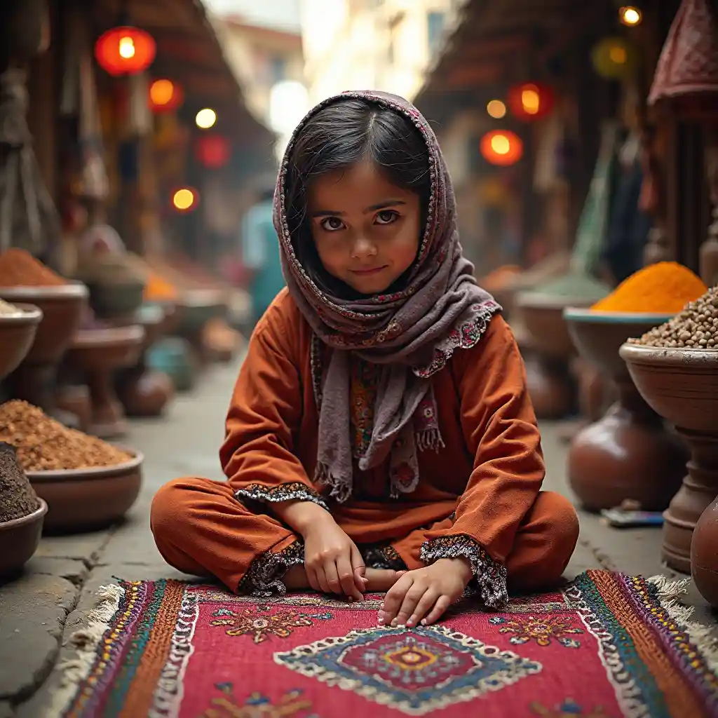 Msichana mwenye umri wa miaka 9 kutoka Mashariki ya Kati akiwa na kofia anafanya kazi ya kushona kwenye soko lenye shughuli nyingi, akiwa amevaa vazi lenye vilemba vya hariri. Viwanja vya vikolezo na taa humweka ndani, na vidole vyake vyenye ustadi vinaonyesha kiburi cha kitamaduni katika soko lenye msukumo na rangi nyingi.