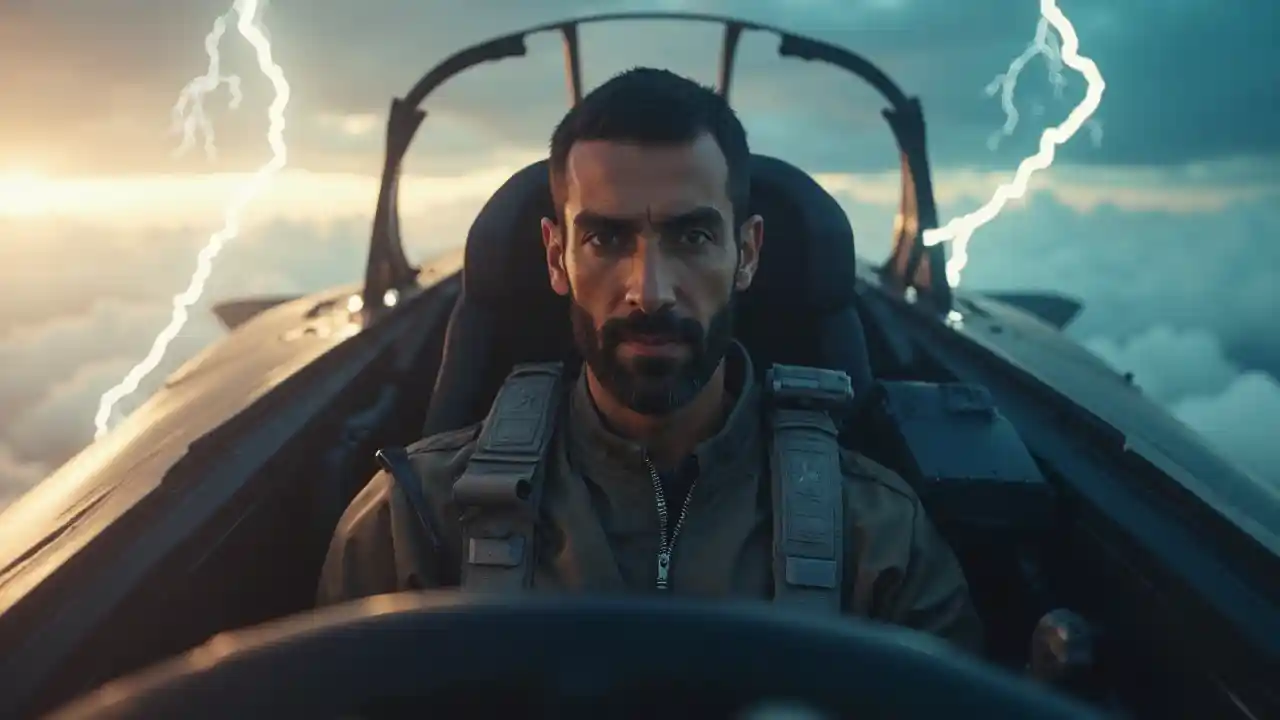 Akiruka ndege isiyoonekana kupitia anga lenye dhoruba, mwanamume wa Mashariki ya Kati mwenye umri wa miaka 30 hivi anaonekana vizuri akiwa na suti ya kuruka. Umeme na mawingu humweka katika mazingira, udhibiti wake wenye umakini na macho makali yanayotoa nguvu na charisma ya hali ya juu katika mandhari yenye kusisimua ya juu.