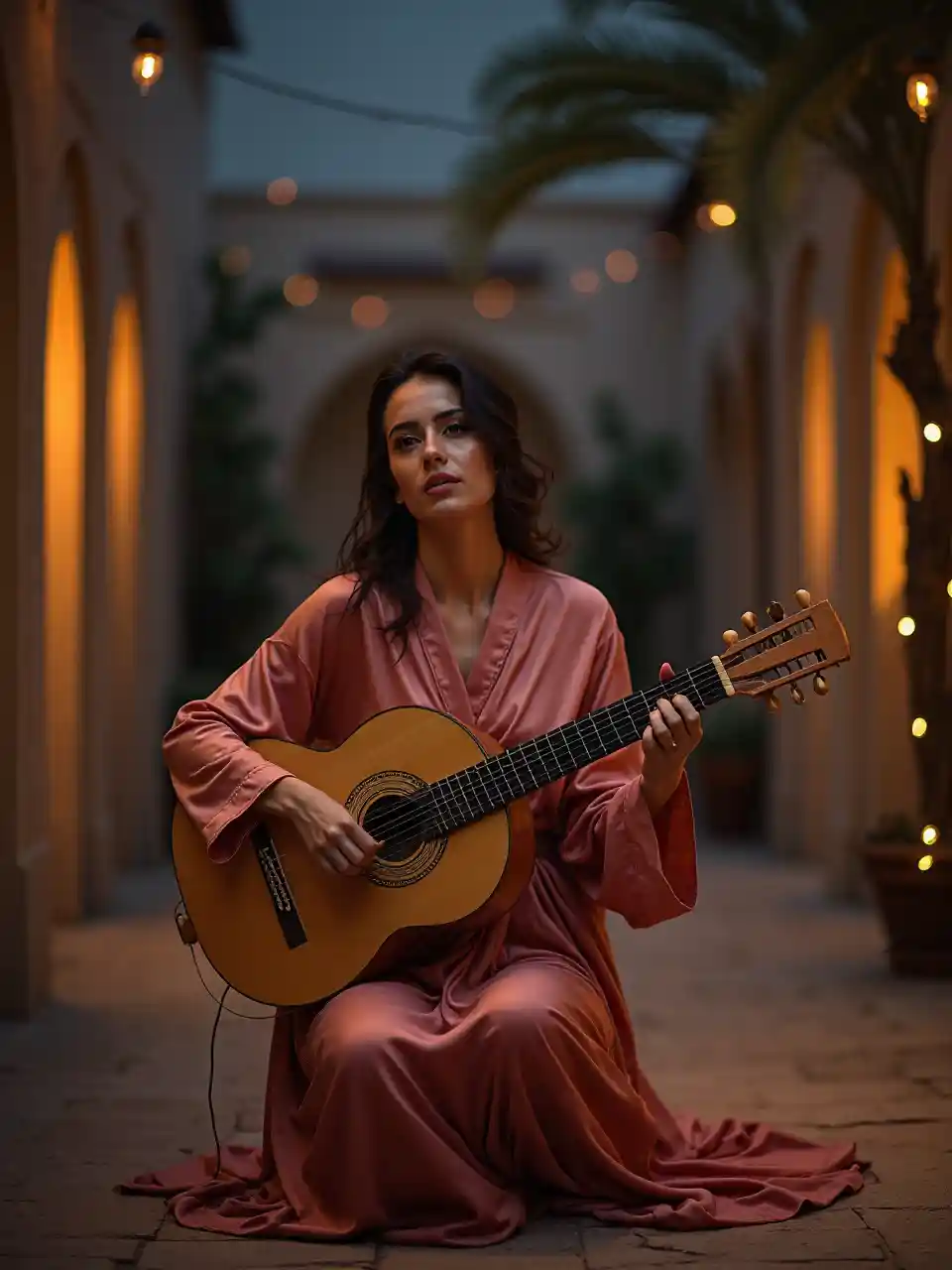 Akicheza oud katika ua wa giza, mwanamke wa Mashariki ya Kati mwenye umri wa miaka 40 na kitu anatoa mwangaza akiwa amevaa vazi la hariri. Milango yenye minara na nyota humweka katika mazingira, na muziki wake wenye kuvutia huchochea hisia za ngono.