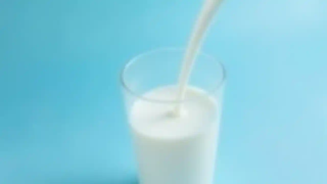 BettyMaziwa meupe hutiwa katika glasi yenye rangi ya bluu