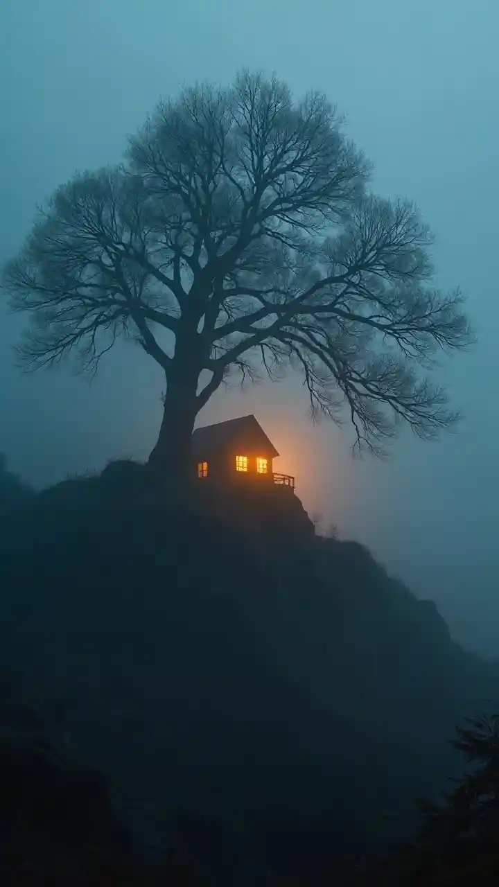 Picha hiyo inaonyesha mandhari yenye utulivu na ukungu, na nyumba ya faragha iliyo kwenye mwamba, iking'arishwa na mwangaza wa ndani. Mti mmoja unasimama mbele, matawi yake yanapenya gizani, na nuru yenye kung'aa inatoka katikati yake, na hivyo kuelewana na ukungu.