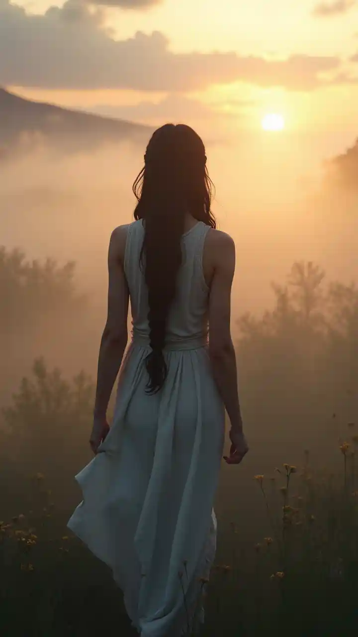 mwanamke kijana, ngozi safi, ndefu nyeusi braided nywele, kutembea katika ukungu nene wa ukungu waingili, kuangalia nyuma, mapema jua, maelezo makali, rangi laini, anga, katikati, ubora bora, kazi ya sanaa utungaji tata, taa ya mazingira, backlighting, (unreal engine 5 lighting effects) (ray-traced-shadows)