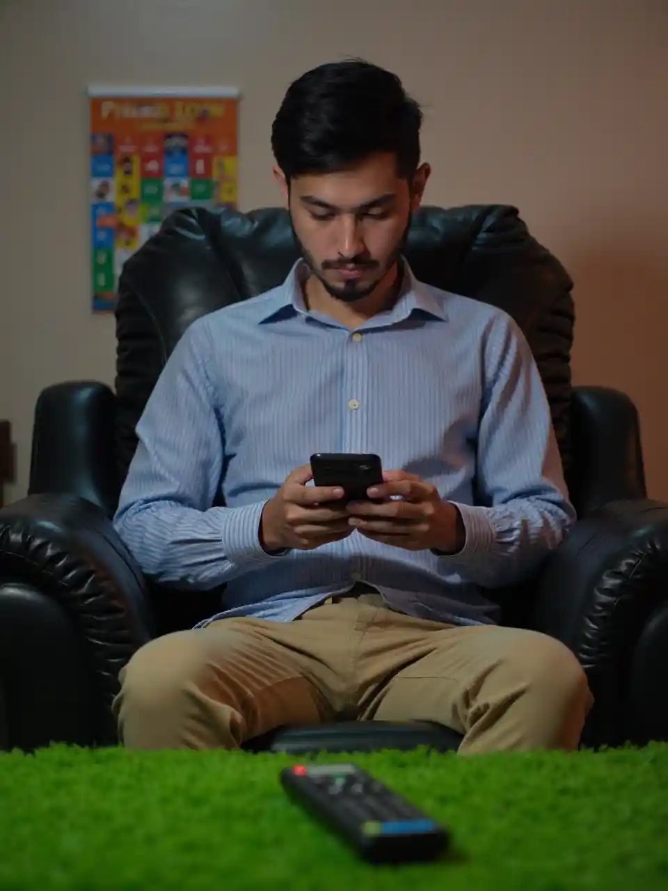 Kijana mmoja ameketi kwa raha kwenye kiti chenye giza, na macho yake yanaka simu yake ya mkononi. Anavaa shati lenye mistari ya bluu nyepesi ambalo linatofautiana na mazingira yake, na pia ana suruali za rangi ya samawati. Kwenye eneo la mbele, kifaa cha kudhibiti umeme kinategemea nyasi za kijani ambazo zimewekwa juu ya meza, na hivyo kuifanya eneo hilo lionekane kuwa lenye kupendeza. Mazingira yanaonyesha mahali penye kupendeza pa ndani, ambapo nuru ya mazingira inaonyesha saa za jioni, na kalenda yenye rangi nyingi yenye herufi mbalimbali imewekwa ukutani nyuma yake, ikionyesha kwamba maisha ya kibinafsi na ya jamii yanachanganya mambo. Hali ya hewa hutoa pumziko na kukimbia kwa muda mfupi, ikionyesha maisha ya kila siku ya kisasa.