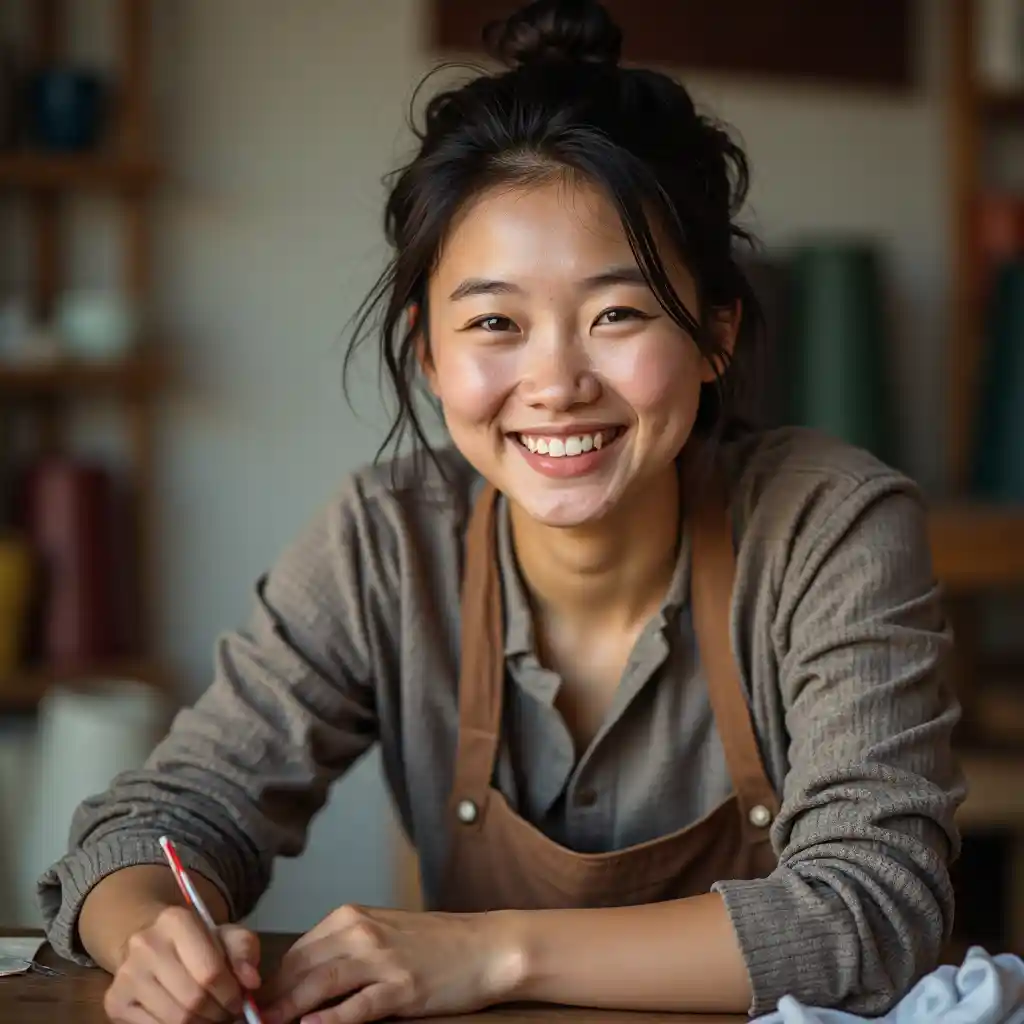 Tafadhali toa picha ya utangazaji ya mwanamke wa biashara ndogo na za kati ambaye anaendesha semina ya kushona. Mwanamke kijana mwenye sura ya Kimongolia, mwenye nguvu, mwenye shauku, na mwenye kutabasamu.
