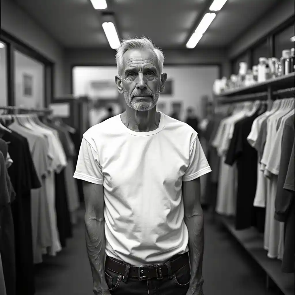 Picha ya picha ya kina sana, grained picha, vizuri sumu, picha monochrome, 50s picha mtindo, mtindo magazine kupiga picha, leica summicron 35mm f2.0, kodak 400tx, mtindo upigaji picha, mtindo mfano, William S. Burroughs, mzee amevaa T-shati nyeupe katika duka la nguo, mockup up