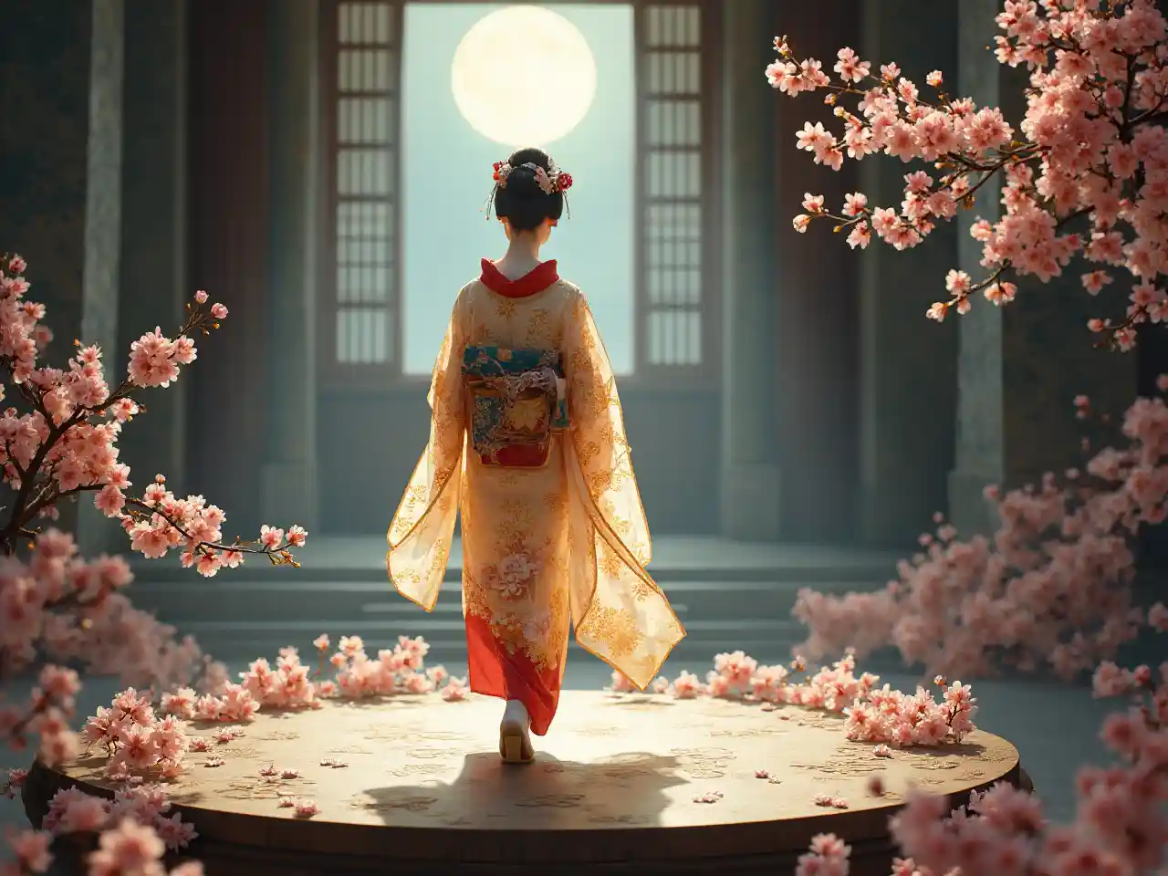 Mke fulani anayeitwa geisha, akiwa amevaa kimono chenye rangi ya kijani na uzi wa dhahabu, anatembea kwenye jumba la mfalme lililo na maua. Sehemu: Jumba la kifalme lenye kuta ndefu na madirisha ambayo mwanga wa mwezi huangaza. Jukwaa lenye maua likiwa limepambwa kwa matawi ya cherry. Geisha katika mavazi ya jadi ya Kijapani yenye kimono ya uwazi na kimono yenye rangi ya cherry. Geisha anatembea juu ya jukwaa, kana kwamba anateremka juu ya maua. Maelezo ya ziada: Maua ya cherry kwenye jukwaa ni ya rangi mbalimbali, kuanzia nyeupe hadi rangi ya waridi. Kimono cha geisha hufanywa kwa kitambaa chenye kung'aa, ambacho mwili wake huonekana kupitia. Kimono hicho chenye vilemba vya maua ya cheresi na uzi wa dhahabu huangaza kwa mwangaza wa mwezi. Geisha huyo anajiweka kwa njia ya kupendeza na anatembea kwenye jukwaa kana kwamba anateremka juu ya maua.