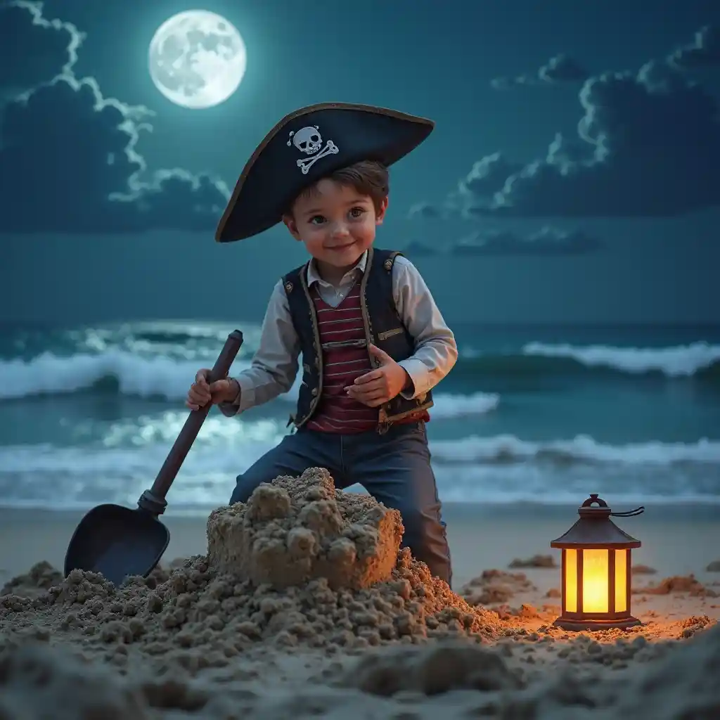 Mvulana mweupe mwenye umri wa miaka 7 mwenye madoadoa anajenga ngome ya mchanga kwenye pwani yenye mwezi, akiwa amevaa kofia ya maharamia na koti lenye mistari. Mawimbi yenye kuvuma na taa zenye kung'aa humweka katika mandhari, na vipande vyake vinaonyesha uwezo wa kuwazia na roho ya kutaka kuwa na maisha mapya katika eneo la pwani lenye ndoto.