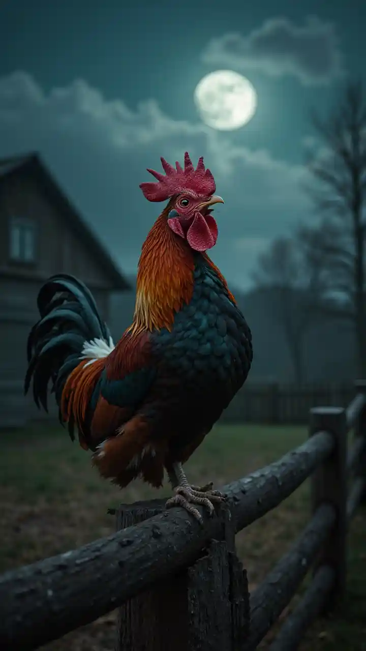 LaylaRooster ameketi juu ya ua katika uwanja wa shamba, mwanga na mwanga wa mwezi, na mdomo wake wazi kuimba.