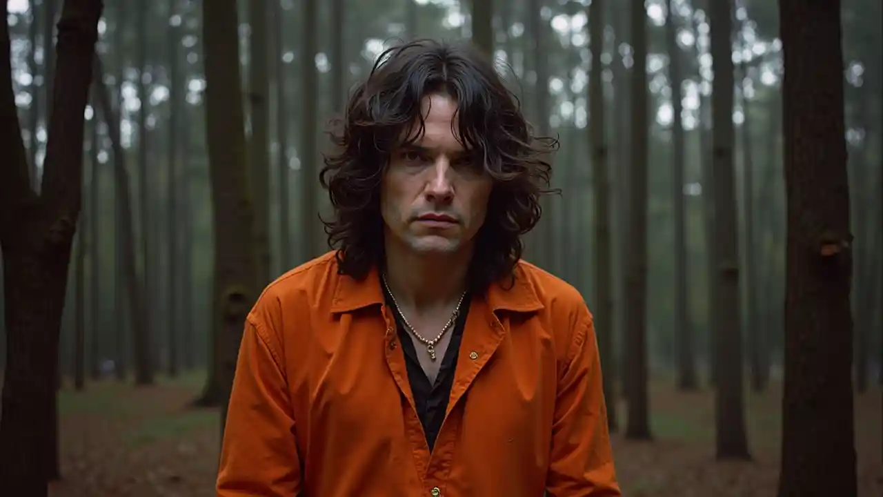 Picha ya Jim Morrison akiwa na mavazi ya Halloween ya rangi ya machungwa na nyeusi.