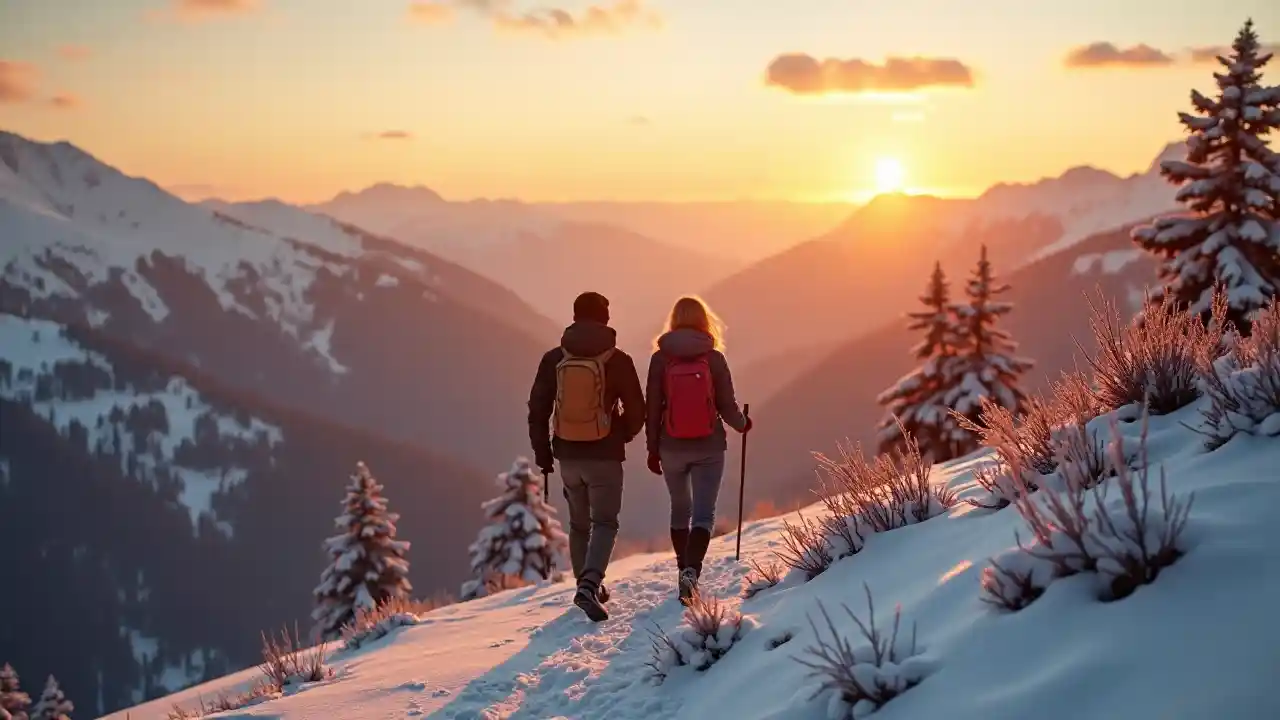 Safari ya Kimapenzi ya Kutembea Juu ya Milima Yenye Theluji Jua Linapochomoza