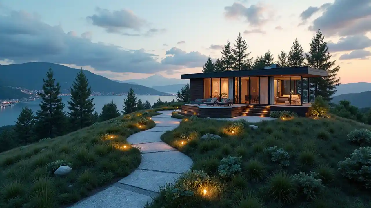 kisasa ndogo cozy nyumba juu ya mlima juu na miti ya kijani na nyasi, barabara inaongoza kwa, maoni ya kijiji na bahari, picha ya kweli, njia ya kutembea, whide mapumziko ya usiku taa , pana maegesho