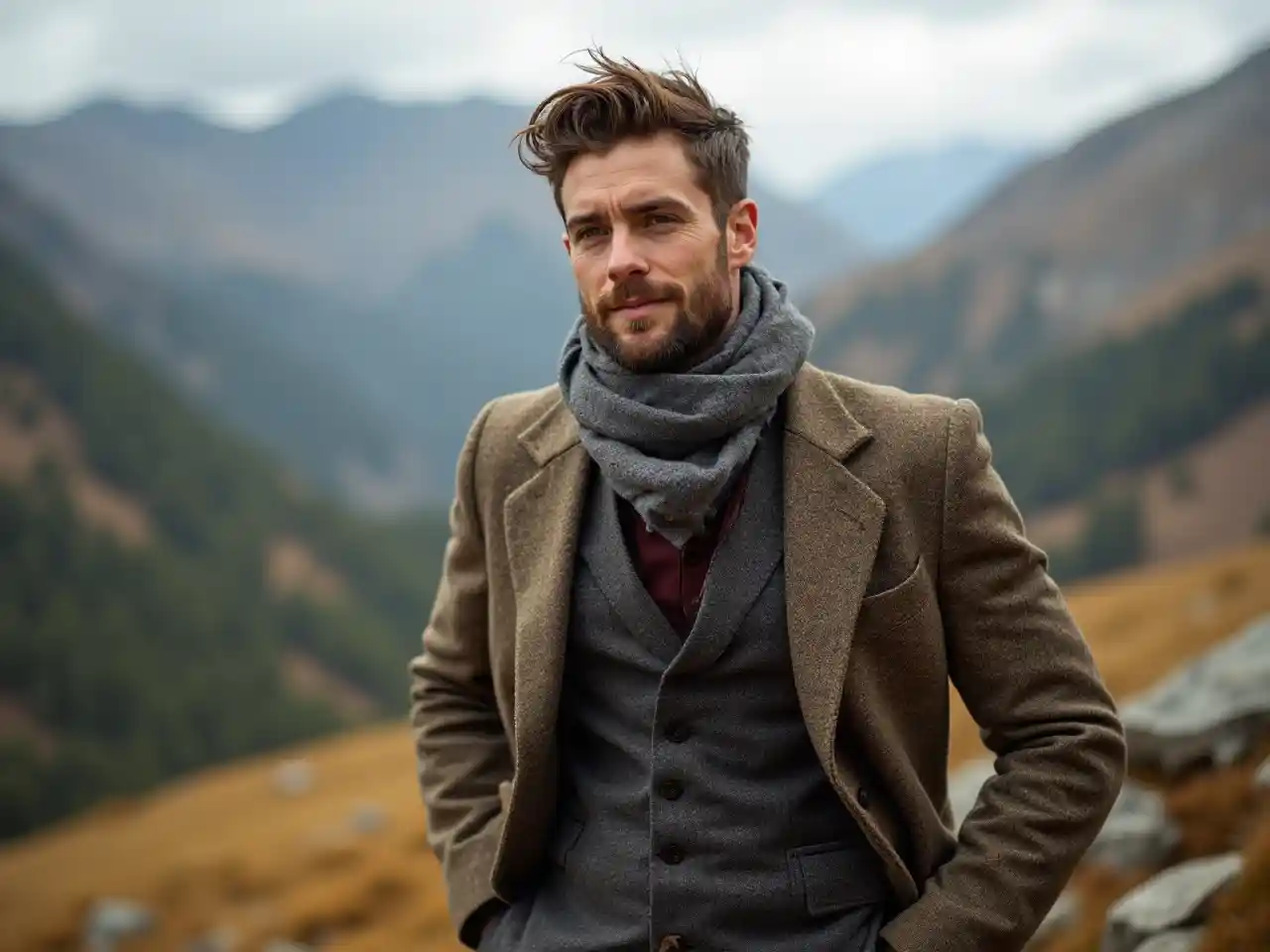 mtu mgumu katika milima kuvaa suti nzuri ya tweed, shati la cashmere.