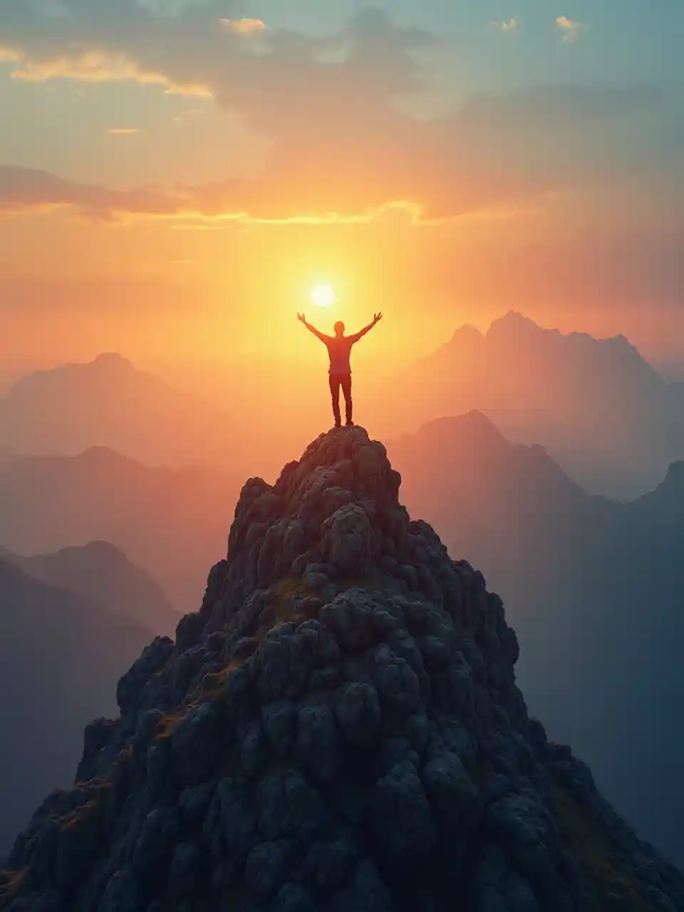 Mtu anayesimama kwa ushindi juu ya kilele cha mlima wakati wa mapambazuko, akionyesha mafanikio na mwanzo mpya