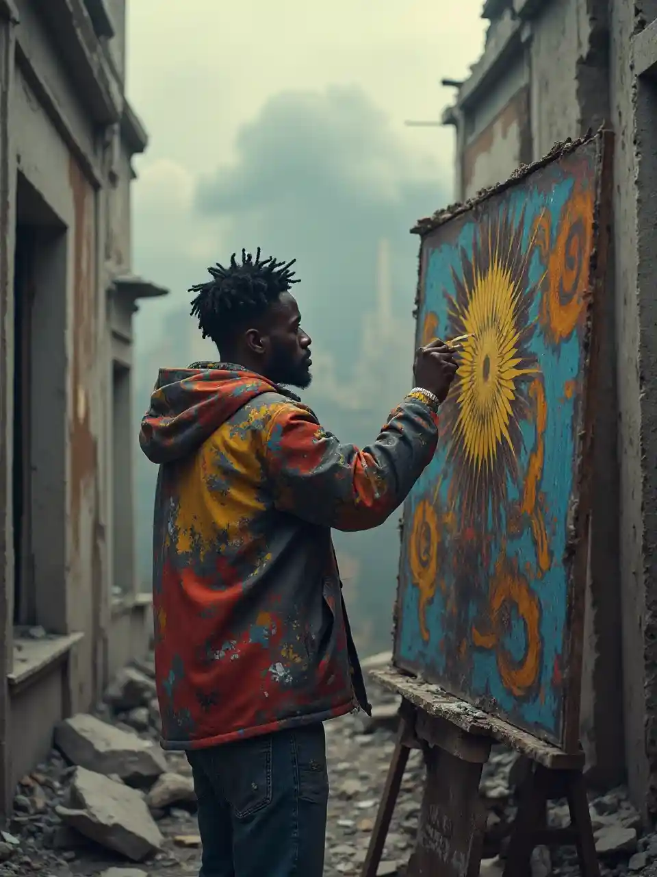 Akichora picha kwenye ukuta wa nyuma ya mwisho, mtu mweusi mwenye umri wa miaka 35 hivi anaangaza akiwa na koti lililotiwa rangi. Kuta zinazovunjika na mawingu ya majivu humweka, shauku yake ya ubunifu na umakini mkubwa unaotoa sanaa yenye nguvu na uwezo wa kuhimili katika mazingira ya kutisha.