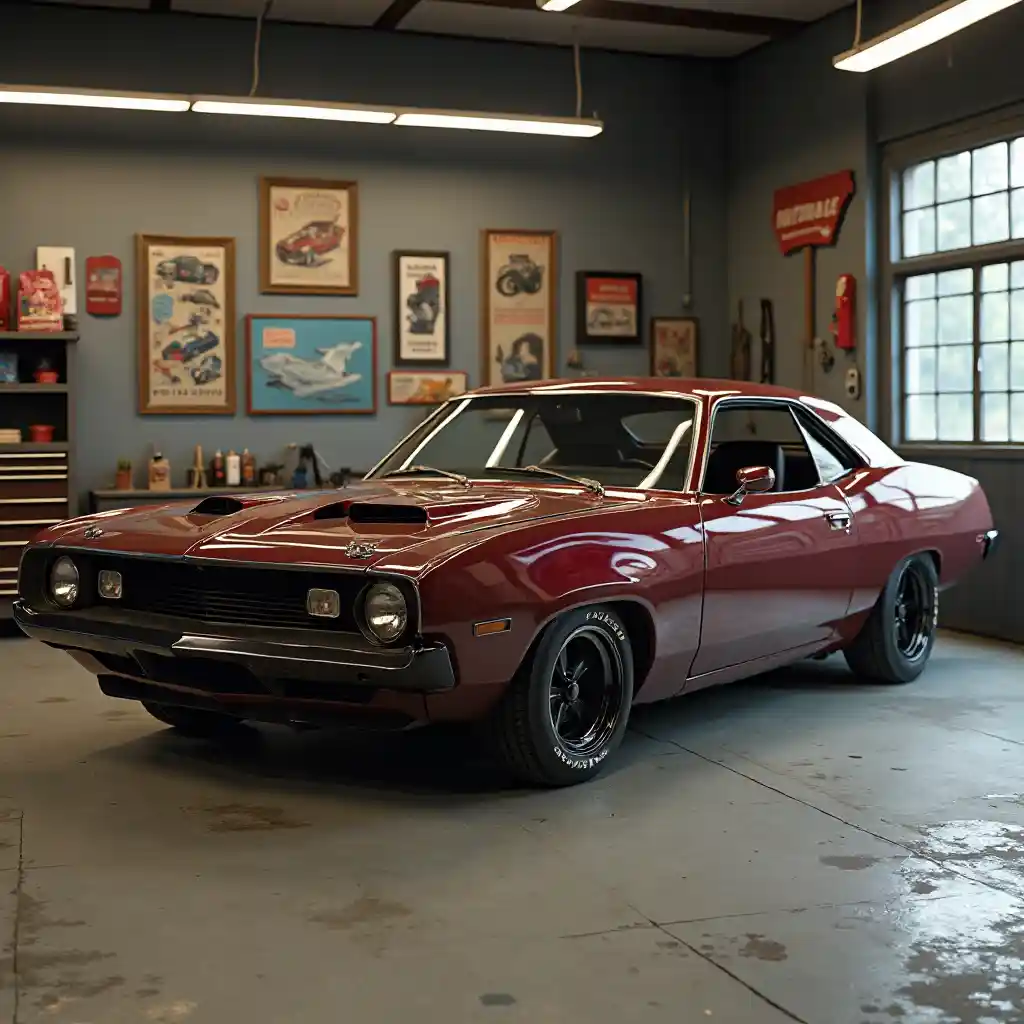 Gari la kawaida la Marekani lililoongozwa na gari la misuli, lililopungua, rangi ya kahawia na mistari ya kahawia na matairi ya rangi ya nyeusi. Iliegeshwa kwenye karakana na vifaa na mabango ya kawaida. Kufanya Mambo Kihalisi