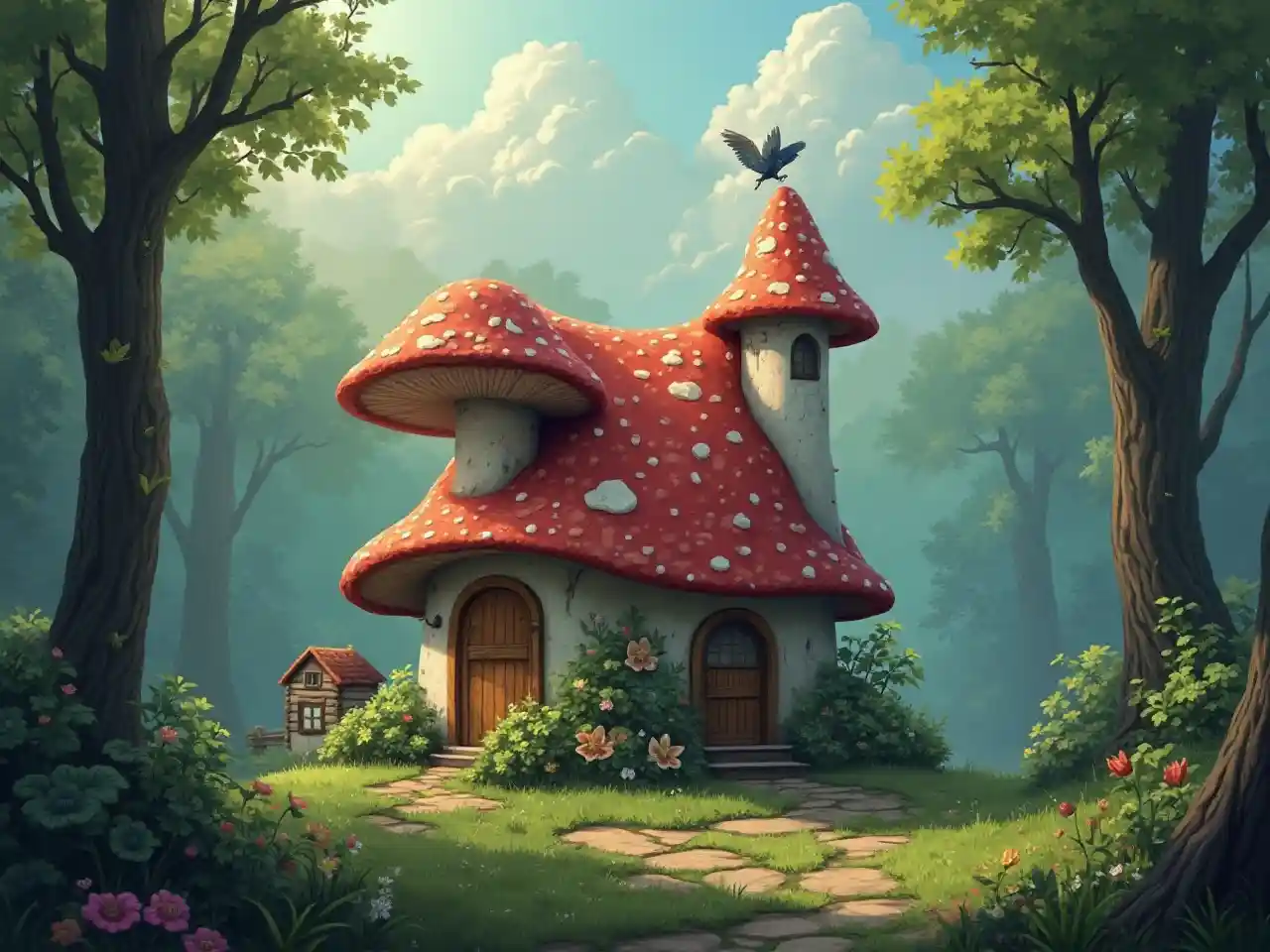 stxphNyumba na paa uyoga katika mistic msitu na shamba ndogo nje na moshi ndege