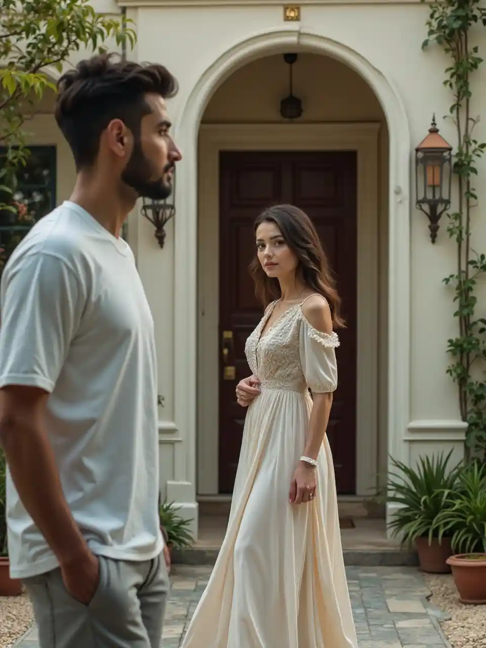 Kijana wa Kiislamu akipita mwanamke barabarani , mwanamke mrembo akisimama kwenye mlango wa nyumba yake , kwa sura ya kupendeza , mwanamke kijana aliyevaa mavazi mazuri .