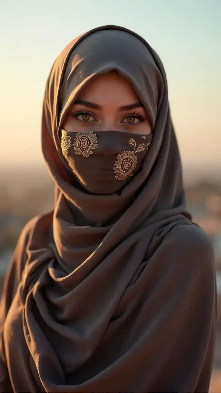 Picha yenye mambo mengi sana, na yenye kutegemeka sana ya mwanamke Mwislamu mwenye mwili mzuri. Juu ya anga safi la jioni. Mchezo wa nuru na vivuli. Mtazamo wa mbele. Anatomy sahihi. (Msimamo sahihi wa kina sana). (Mwili kamili mtazamo kutoka kichwa kwa miguu), umbali POV, mwili mzima mtazamo. ((Macho mazuri sana, yenye furaha)) ya mwanamke wa Kiislamu. Anavaa hijabu ya kitamaduni. Wake chini nusu uso, kwa kufunikwa na (maski kitambaa) mapambo na embroidery. Uangalifu wa ziada hutolewa kwa athari ya HDR, ambayo huathiri tofauti na muundo. Picha ni hyper-kweli na umakini mkali, kuzalishwa na azimio la megapixels 64. Akiwa na mwili wenye nguvu na usawa kamili wa kike. Mtazamo wake wenye shauku na upendo unanivutia. Rangi yake nyepesi yenye rangi ya joto pamoja na vipaji vyake vyenye kueleweka, huleta hali ya urafiki. Kutoa uzoefu ultra-kweli, alitoa kwa kiwango cha juu ya maelezo kwa kutumia, (UHD 32K). Octane kutoa.
