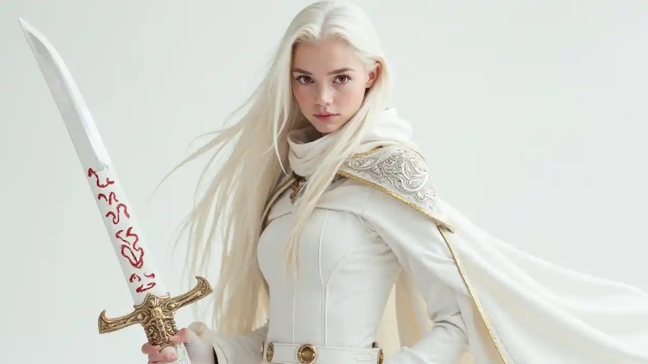 picha ya mwili mzima wa msichana mweupe mwenye kuvutia, mwenye nywele ndefu, akiwa na uhakika juu ya mandhari nyeupe. Macho yake ni mekundu sana, na yanatoa mwangaza wa joto. Amevaa mavazi meupe, kutia ndani upanga mweupe wa ngozi ambao anaushika kwa ustadi. Silaha hiyo imechongwa kwa alama nyekundu zenye kung'aa ambazo huonekana kuwa na nguvu. Mshiko wake una umbo la dhahabu na miundo yenye kutatanisha, na hivyo kuimarisha uzuri na uzuri wake. Anavaa vazi jeupe lenye mapambo ya dhahabu na fedha, ambayo huongeza mguso wa kifumbo kwa pamoja yake. Pia vazi hilo lina ubao wa dhahabu kwenye kingo zake, jambo linaloongeza uzuri na kuonekana kuwa mfalme.