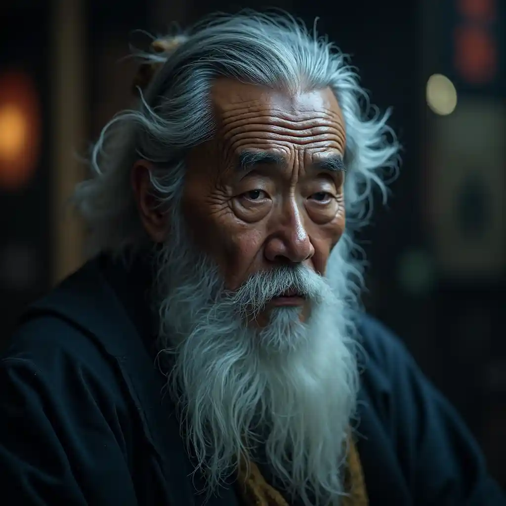 Mwanamume mwenye busara Kijapani kutoka Tokyo na ndevu nyeupe, tata, umakini mkali, fantasy, taa ya sinema, nyingine ya dunia, surreal 8K picha, giza mood aesthetic