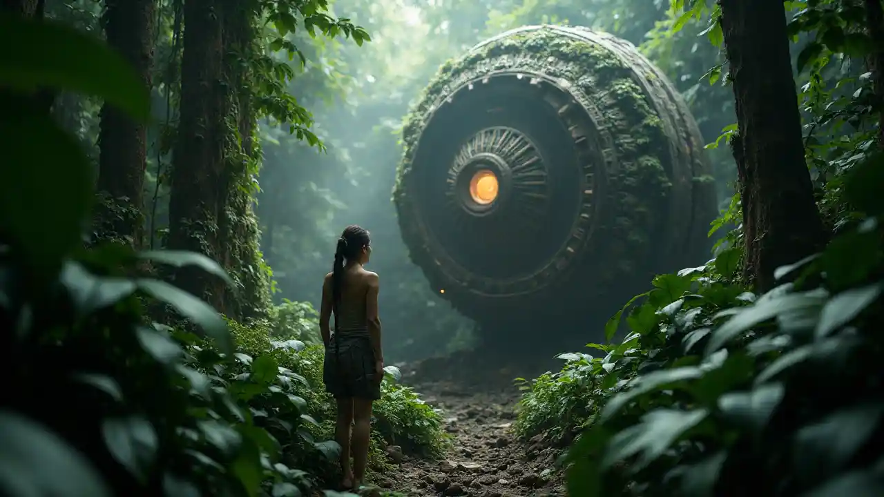 Picha ya hali ya juu ya 10k inayoonyesha kipande cha sanaa kilichofichwa ndani ya msitu wenye rutu. Katikati ya eneo hilo la jangwa lenye majani mengi kuna mashine ya ajabu, ambayo ina mambo mengi yenye kustaajabisha ambayo huongeza kina na fumbo kwenye mandhari. Mtafiti mmoja ametoka tu kugundua kifaa hicho cha ajabu, na anaonyesha hisia za kicho na udadisi anapotazama uvumbuzi wake. Kila sehemu ya picha hiyo imechukuliwa kwa uwazi wa hali ya juu, ikihifadhi rangi zenye kung'aa za msitu na muundo tata wa mashine hiyo, ikiamsha hisia za kushangaa na kutamani sana.