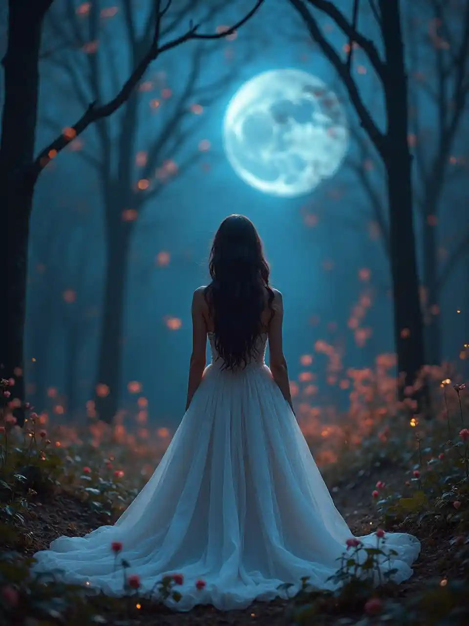 beautiful women with dark brown hair and wear a white gown and stand the forest and see blue moon night scene with mystical swirls, pink mist, gold glitter stars. Cinematic, sharp focus. Close up full frame. Orange blossom backdrop,