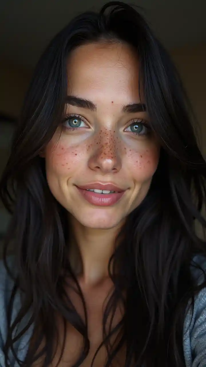 instagram selfie , 23 umri wa miaka mwanamke gorgeous, tabasamu nyepesi, kina ngozi uso na macho, taa ya asili , nyumbani , nywele ndefu, filamu nafaka, tofauti ya chini, uso wa asili, frecks, nywele nyeusi, macho ya giza chini ya macho
