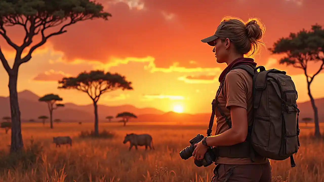 Kati Karibu na mwanamke mwerevu wa asili na vifaa vingi vya upigaji picha na darubini , kundi la simba kwa mbali, savanna ya dhahabu wakati wa machweo, silhouette iliyowekwa na miti ya akasia, anga nyekundu yenye rangi ya moto, ubunifu wa Josephine Wall, Carne Griffiths, na WLOP, rangi ya maji, mazingira ya utu, ubora wa juu, rangi za kupendeza, muundo wa kuvutia.