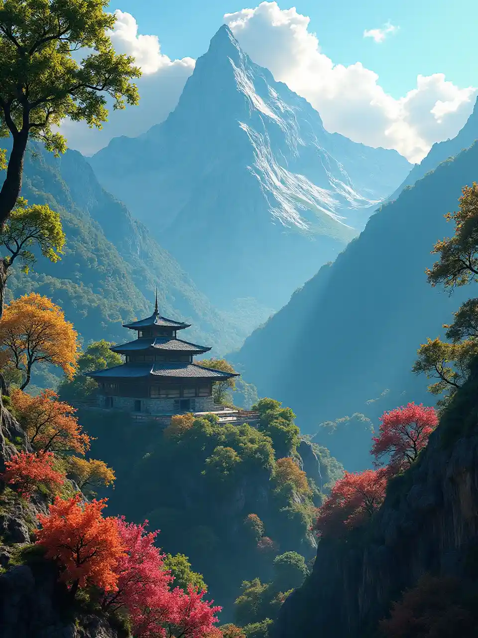 mandhari ya milima, hekalu la utulivu katikati ya kijani kibichi, miti yenye nguvu inayozunguka, maua yenye rangi nyangavu, mandhari ya asili yenye kupendeza, mwangaza wa jua unaopenya kupitia matawi, mazingira ya utulivu, kina cha sinema, mchanganyiko wa mazingira na usanifu, mazingira ya amani na utulivu.
