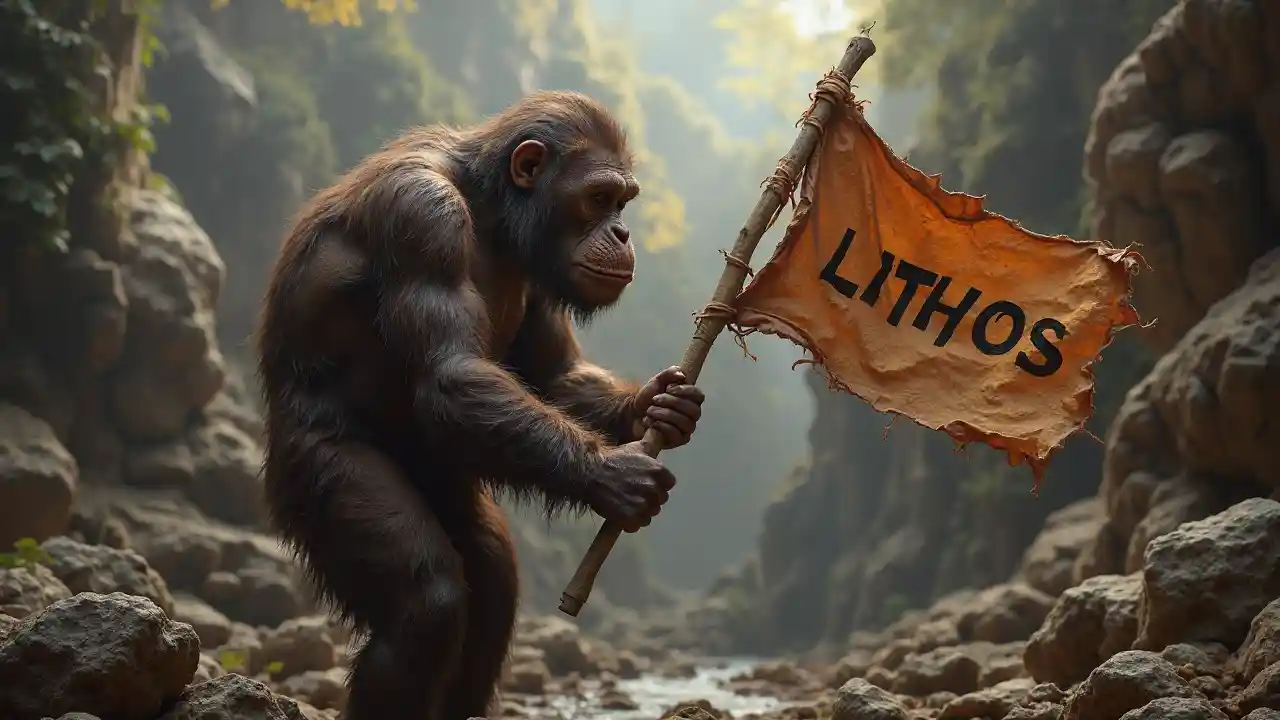 Fanya picha halisi ya mtu wa Neanderthal aliyevaa nguo za Krismasi kati ya fuwele za kwarti na mabaki ya amonia. Neanderthal ana bendera ya kupamba kwenye maandishi ya LITHOS