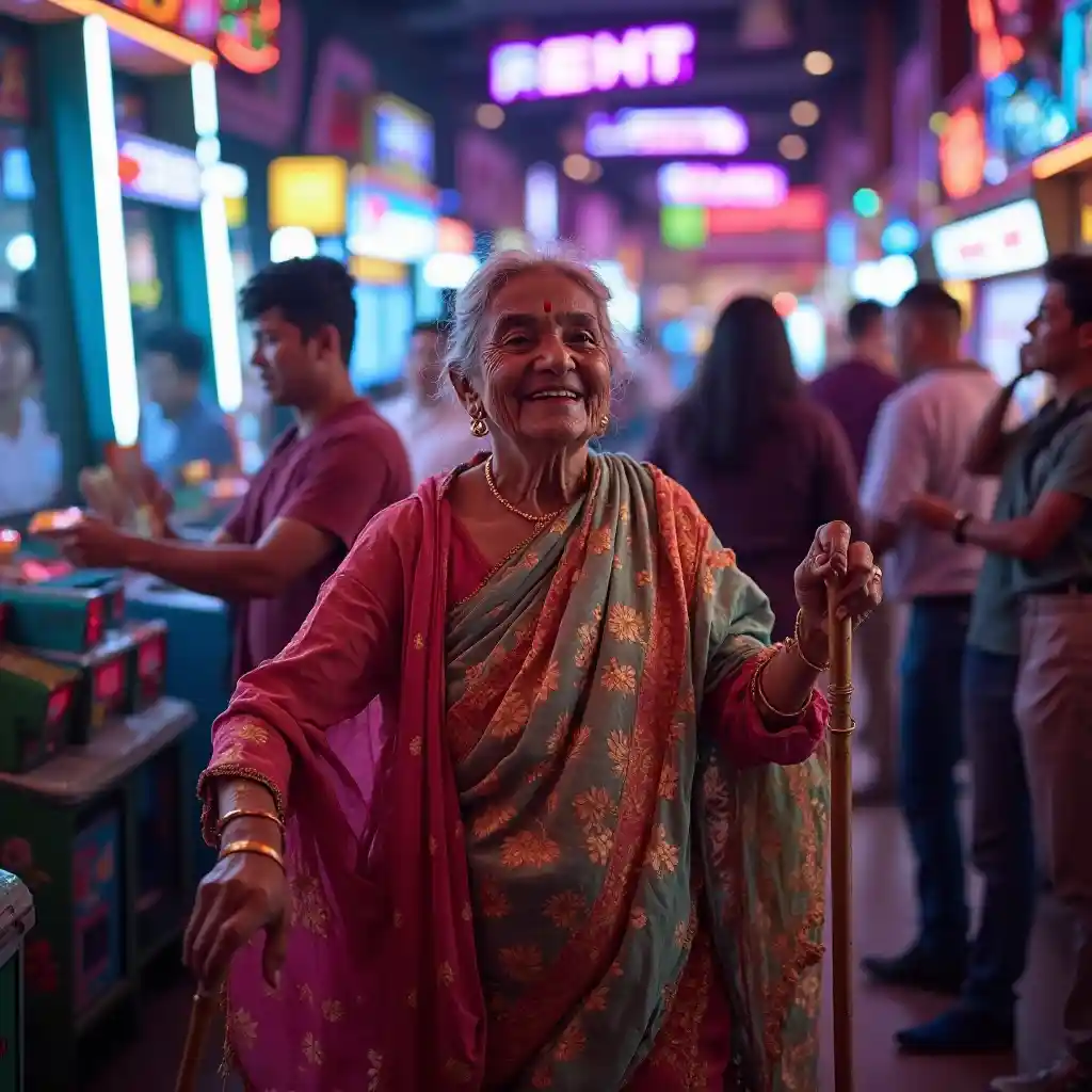 Neon Arcade Joy: Mwanamke Mzee Acheza Na Kijiti