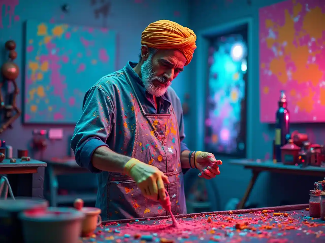 Akishiriki kuchanganya rangi katika studio yenye taa za neoni, mwanamume mwenye umri wa miaka 74 kutoka Mashariki ya Kati akiwa na turban na kanzu iliyo na mado. Maandishi ya hologramu na roboti zinazonguruma humweka katika mazingira yenye nguvu ya kiteknolojia. Sanaa yake huvunja mipaka.