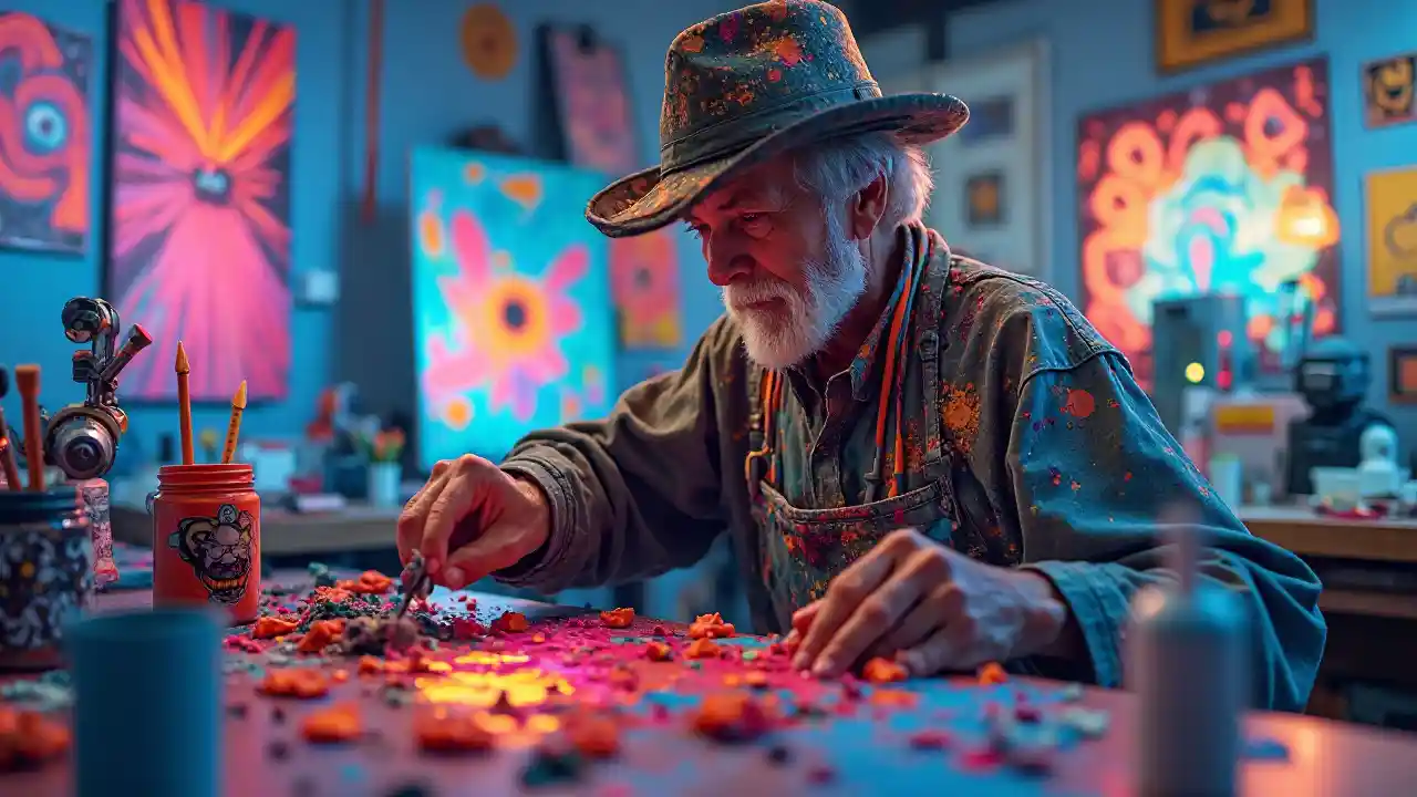 Akishiriki kuchanganya rangi katika studio yenye taa za neoni, mwanamume Mweupe mwenye umri wa miaka 76 akiwa na kofia na mavazi yenye mado. Maandishi ya hologramu na roboti zinazonguruma humweka katika mazingira yenye nguvu ya kiteknolojia. Sanaa yake huvunja mipaka.
