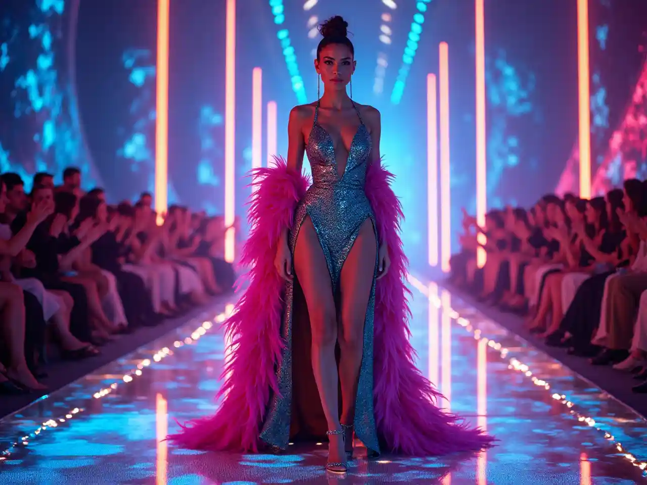 Akijionyesha kwenye njia ya kuegesha magari yenye taa za neoni, mwanamke wa Mashariki ya Kati mwenye umri wa miaka 40 na kitu anaonekana kwa mavazi yake ya juu yenye manyoya. Vijia vya maonyesho ya hologramu na umati wenye kusisimua humweka katika picha, miguu yake yenye umbo na kiuno chake kinachong'oa mvuto wa mtindo wa juu na hisia zenye kujiamini katika mandhari ya wakati ujao yenye kuvutia.
