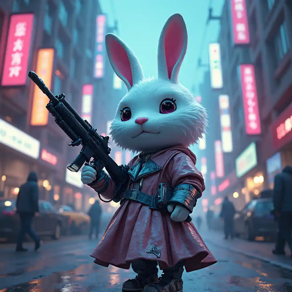 ScottWhite Rabbit na msichana katika mji na bunduki na roboti mavazi ya msichana , katika mji katika rangi