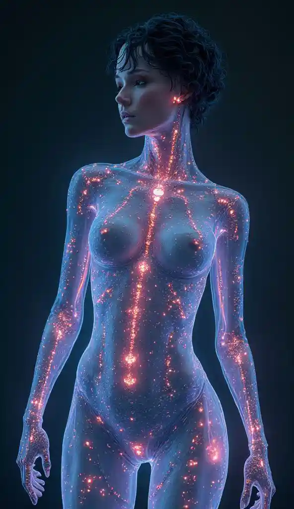 LucasMwanamke kijana wa Intaneti, uso tata, mwili, anatomy kamili. Mikono na miguu yake ya cyber ni ya kupitia, yenye maelezo, nuru ya neon inaonyesha anat yake ya cyber