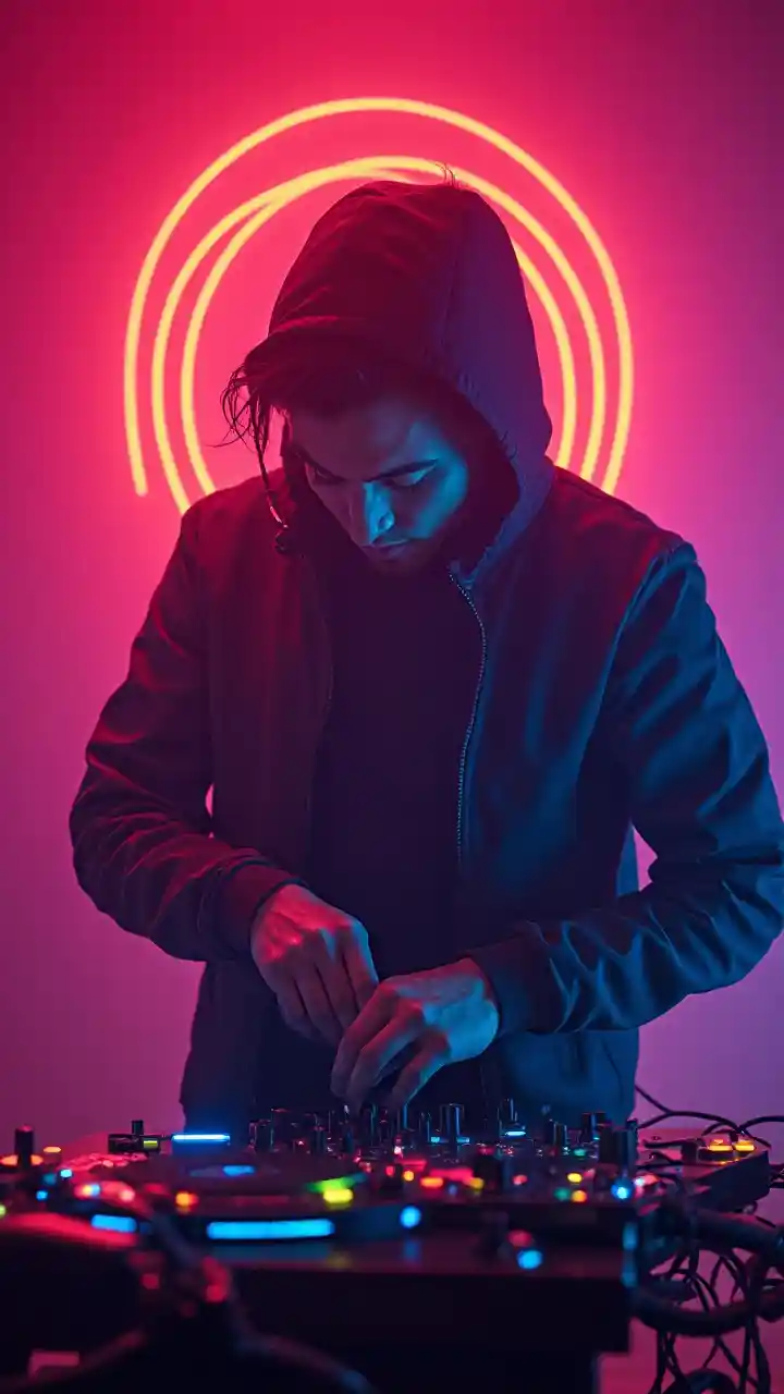 Jonathanpicha ya mbele ya kuonekana kwa binadamu cyberpunk na adifonos rangi neon nyuma scenography ya spheres disco kwa namna ya jua
