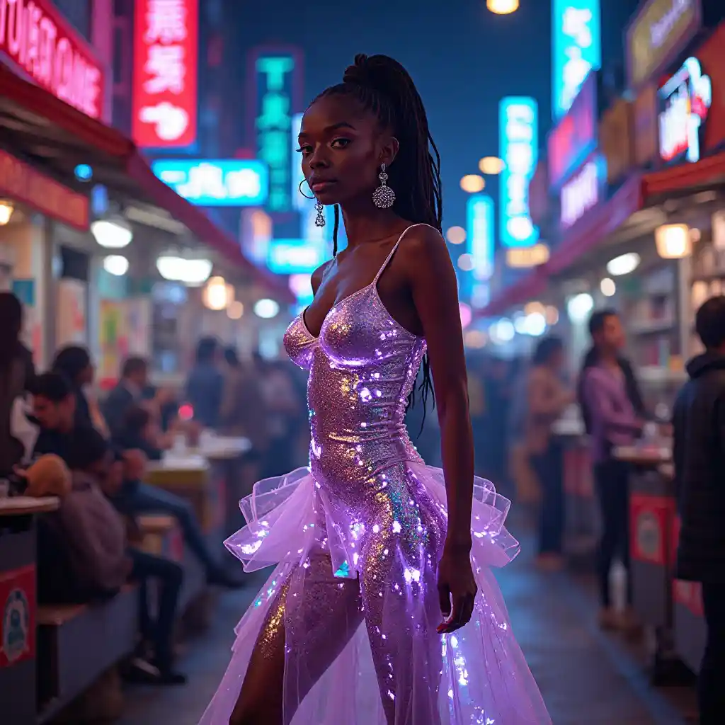 Akionyesha mavazi ya hologramu katika soko la cyberpunk, mwanamke mweusi mwenye umri wa miaka 30 na kitu anajivunia ishara za neon. Viwanda vinavyorefuka na vifaa vya kiteknolojia humweka katika hali ya kujiheshimu, na hivyo kumfanya awe na hisia nyingi.