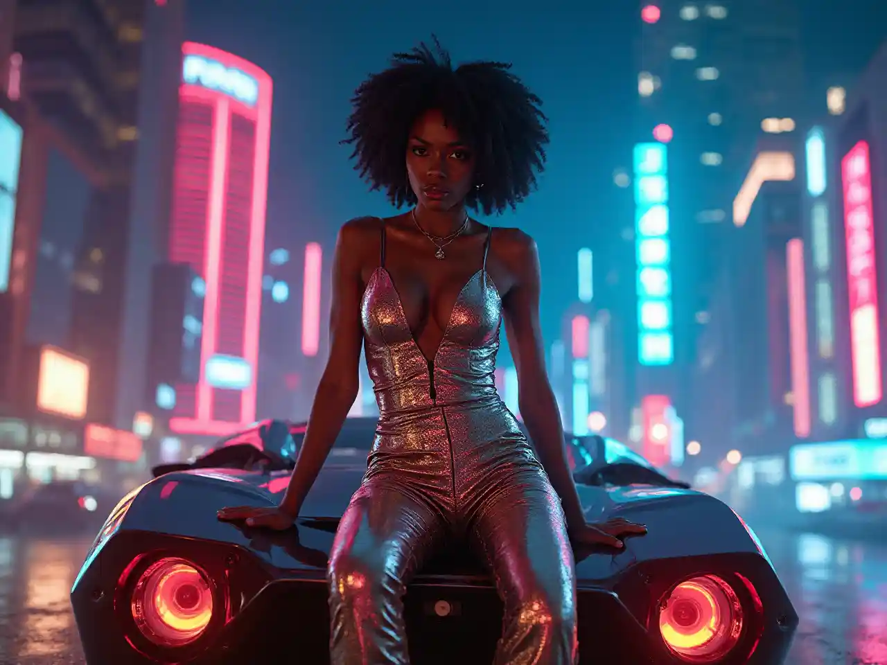 Akitoa picha kwenye gari lenye mwangaza wa neoni, mwanamke mweusi mwenye umri wa miaka 25 hivi anaangaza akiwa na suti maridadi yenye vipande vya chuma. Mazingira ya jiji ya hologramu na anga zenye nyota humweka katika mazingira, miguu yake yenye nguvu na kiuno cha chini kinachotoa mvuto wa wakati ujao na hisia za kusisimua katika eneo la sayansi.