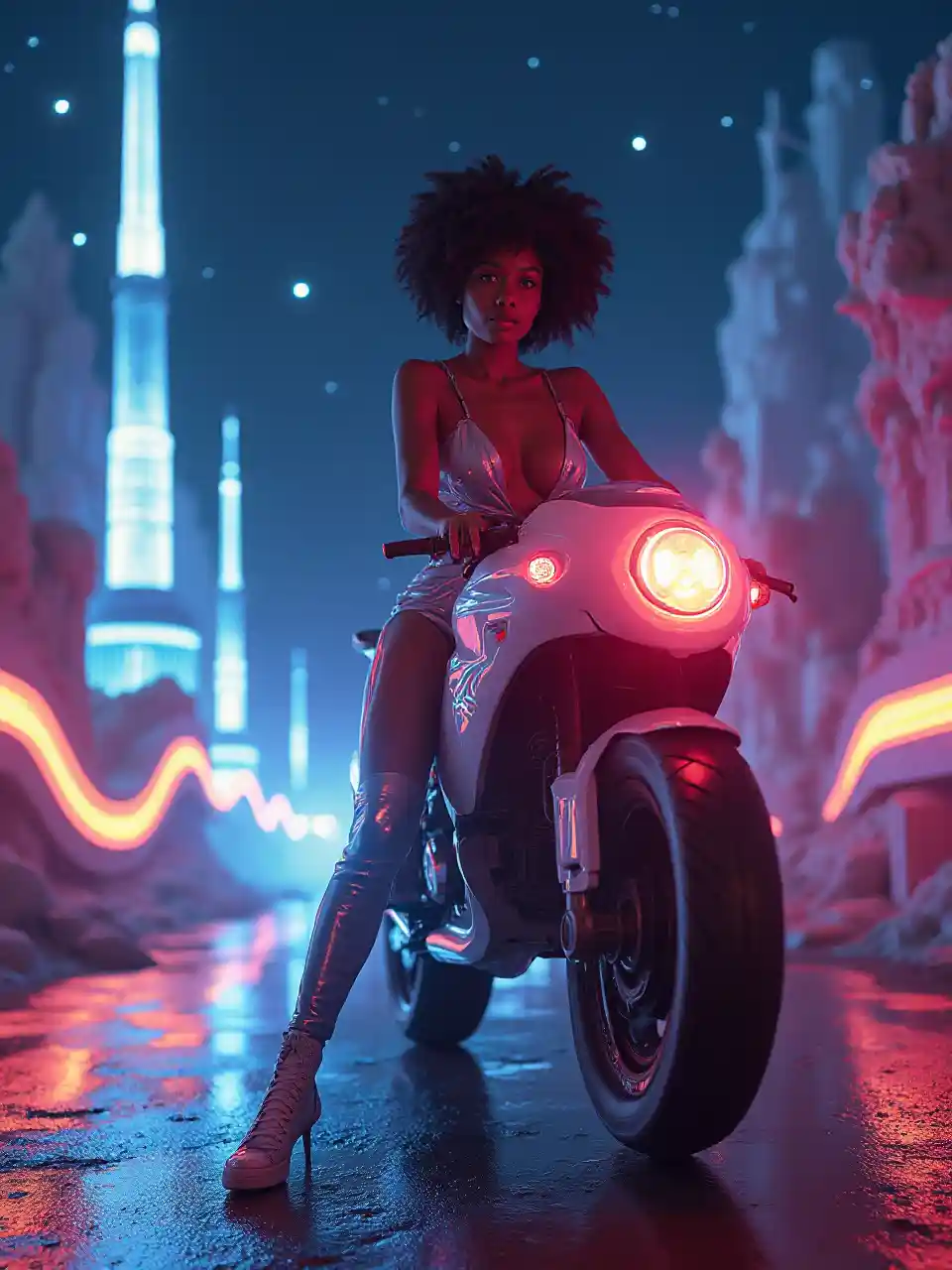 Akitoa picha kwenye baiskeli yenye mwangaza wa neoni, mwanamke mweusi mwenye umri wa miaka 25 na kitu anaonekana akiwa na suti nzuri. Mabonde ya hologramu na anga zenye nyota humweka katika mazingira yenye nguvu, miguu yake yenye nguvu na kifuniko cha shingo yake yenye kuvutia na hisia za kusisimua katika eneo la sayansi.
