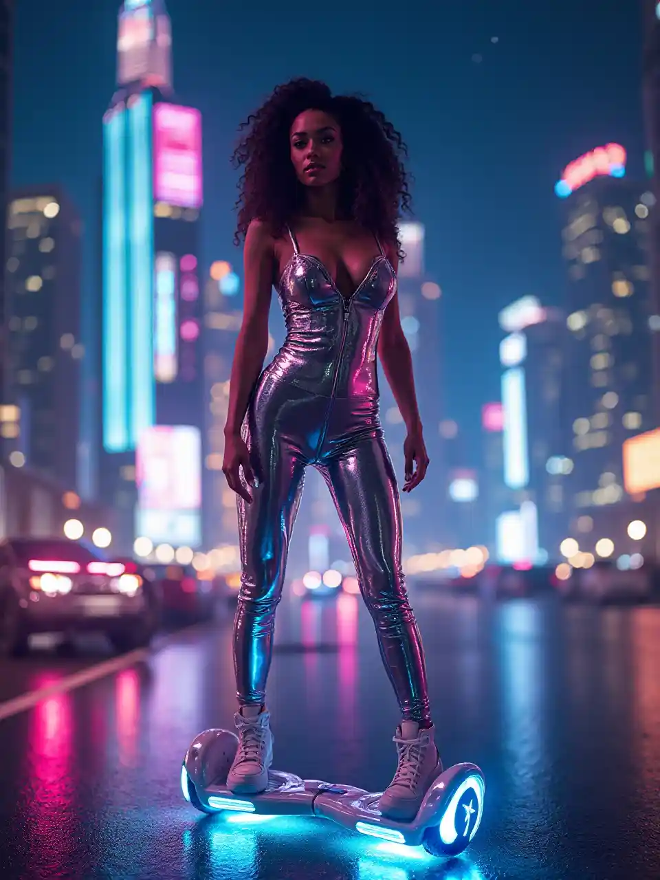 Akijionyesha kwenye bodi ya hoverboard yenye taa za neon, mwanamke wa Mashariki ya Kati mwenye umri wa miaka 35 anaangaza katika suti ya chuma yenye rangi ya LED. Majengo ya juu ya anga na anga zenye nyota humweka katika mazingira yenye kuvutia na yenye kuchochea hisia katika jiji la kisayansi.