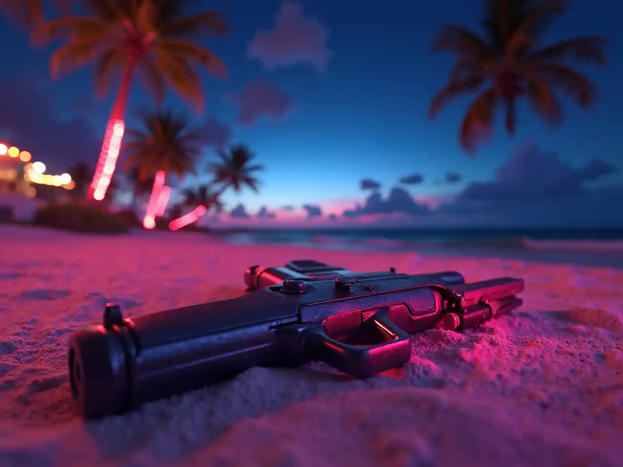 hyper-kweli neon palette, kina sana pwani wakati wa usiku, bunduki kuweka katika mchanga, Miami background, mitende, injini isiyo ya kweli, octane render, taa ya sinema, y2k, rangi mkali, hyper-kweli, angle ya chini, 16K, 8K UHD, 8K texture, cinematic, rim lighting, neon palette, theory ya rangi, dramatic, volumetric lighting, 35 mm, in focus, unreal engine, highly detailed, octane render, ultra-high resolution.