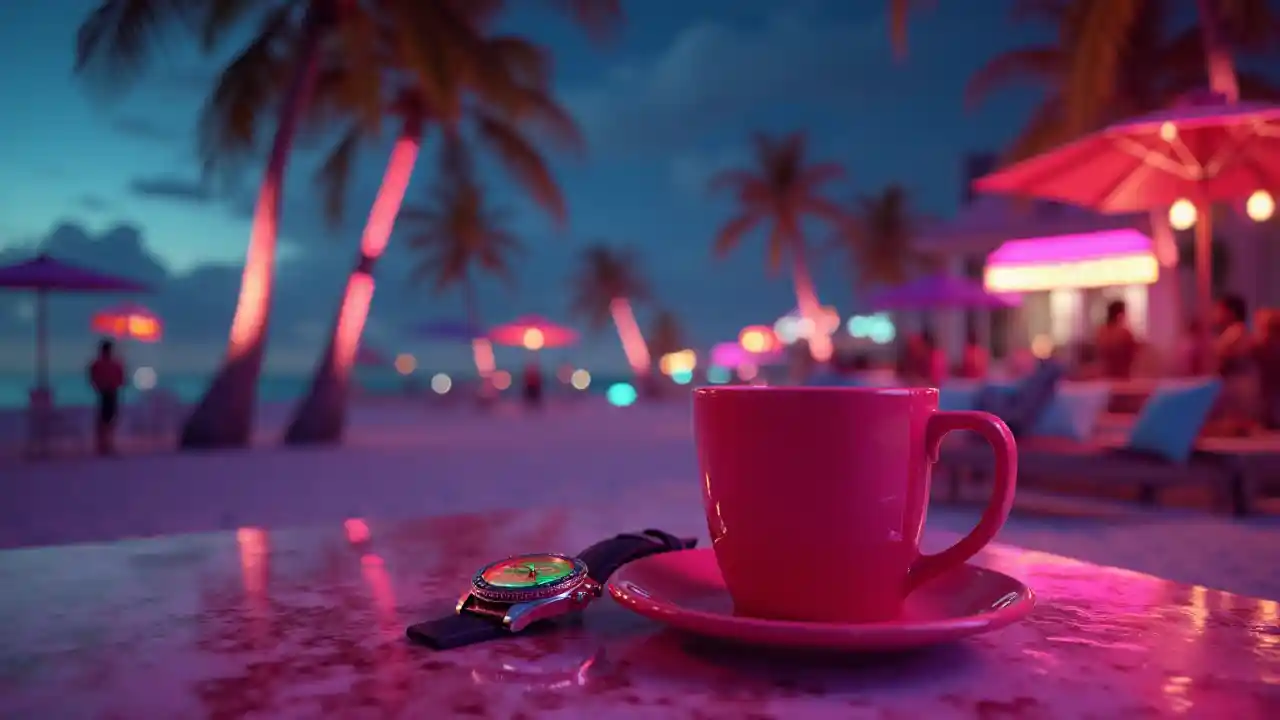 hyper-kweli neon palette, kina sana Miami pwani usiku, kikombe moja nyekundu juu ya meza, saa kigeni karibu na cocaine, Flamingos, mitende, injini ya ajabu, octane render, taa ya sinema, y2k, rangi mkali, hyper-kweli, angle ya chini, 16K, 8K UHD, 8K texture, cinematic, rim lighting, neon palette, theory, dramatic, volumetric lighting, 35 mm, in focus, unreal engine, detailed, octane render, ultra-high resolution.