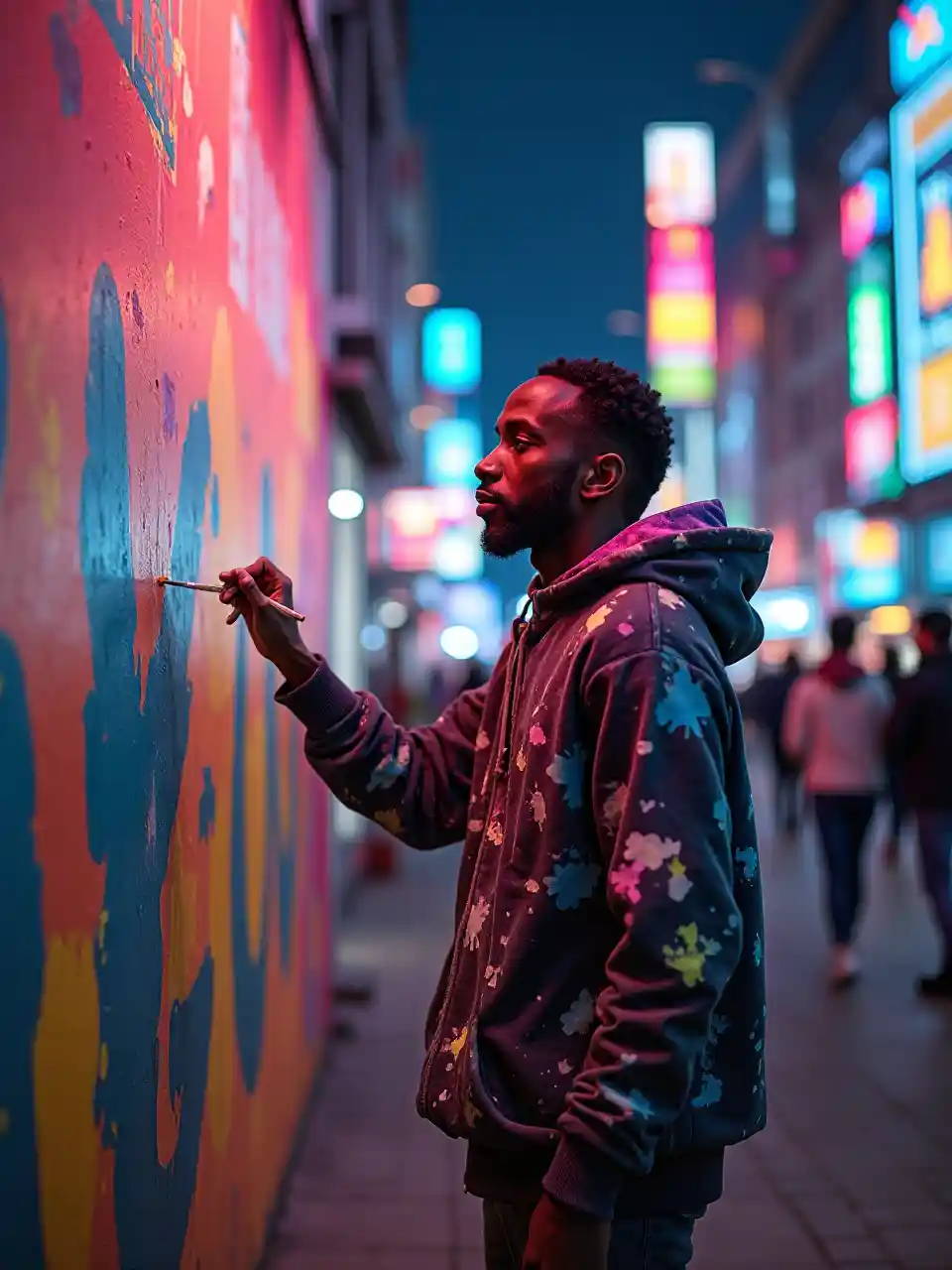 Akipaka rangi ukuta katika uwanja ulioangaziwa na taa za neoni, mwanamume mweusi mwenye umri wa miaka 35 hivi, anaangaza akiwa na koti lenye rangi nyingi. Ishara za holographic na wapita njia humweka, shauku yake ya ubunifu na umakini mkubwa unaotoa sanaa yenye nguvu na mchanga wa mijini katika mazingira ya rangi, ya baadaye.